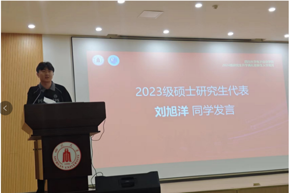 2023级研究生刘旭洋作为老生代表在会上发言。他建议新同学在科研初期注重基础技能的培养,掌握必要的科研工具,逐步明确研究方向,并与导师保持高效沟通。同时,他强调要积极锻炼身体、参与志愿活动和学术会议,丰富研究生生活,提升个人与社会责任感,并鼓励新生在面对挑战时保持坚持与热情,迎接未来无限可能的学术生涯。