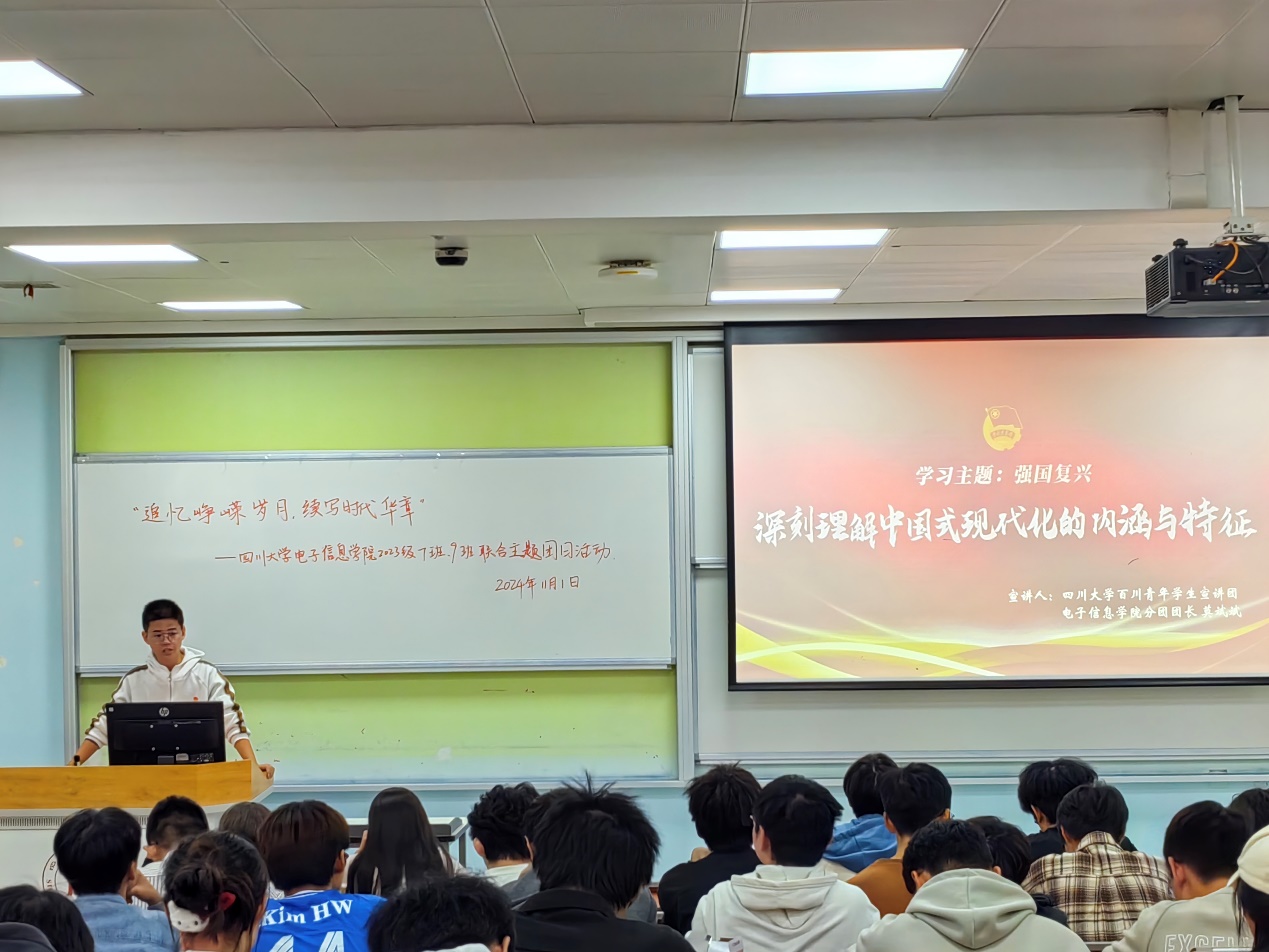 掷地有声,讲以影响思想。太阳网集团tcy8722百川青年宣讲团电子分团团长莫斌斌做了以“深刻理解中国式现代化的内涵与特征”为主题的讲解报告,为同学们深入理解中国式现代化、向着强国复兴不断迈进提供思想引领。