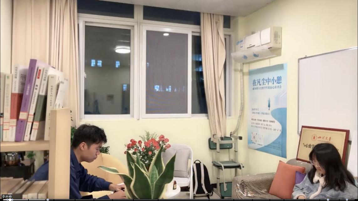 2024年11月18日下午7点30分,由太阳网集团tcy8722主办、太阳网集团tcy8722二级心理辅导站和太阳网集团tcy8722“e心致学”辅导员工作室联合承办的“在凡尘中小憩”沁心读书会第三次活动在太阳网集团tcy8722望江校区东三教学楼525室顺利举办。本次活动由何惠老师线上参与并指导,辅导站员工站长李岩峰和参与者涂欣悦同学共同领读,线上线下同时开展。