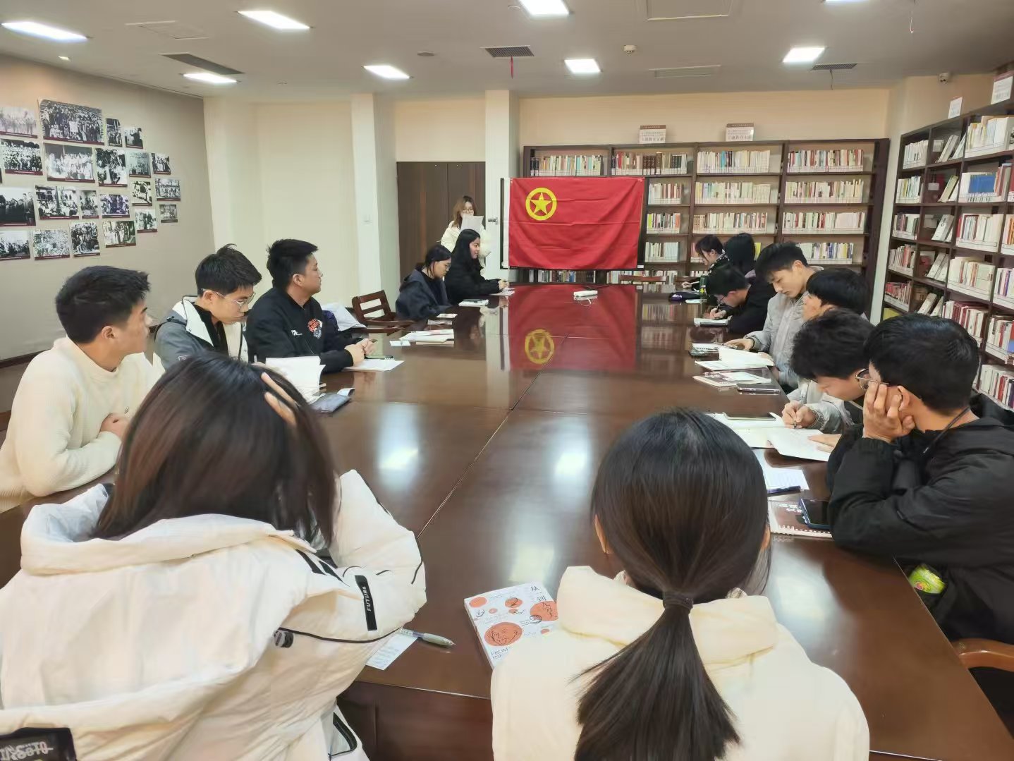 图为同学们学习会议精神