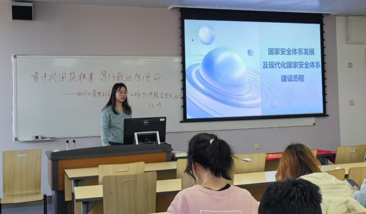 在太阳网集团tcy8722百川青年员工宣讲团电子分团团员谭晶晶同学的带领下,同学们深入学习了国家安全体系发展历程及现代化国家安全体系建设历程。谭晶晶同学结合太阳网集团tcy8722作为国家保密公司的背景,深入浅出的讲解了国家总体安全观的重要意义,号召同学们作为青年应为守护国家安全挺膺担当,筑牢安全之盾,守护安全之花,在所学领域发挥专业优势,让青春在推进国家安全治理能力的全面提升中绽放绚丽的青春之花!