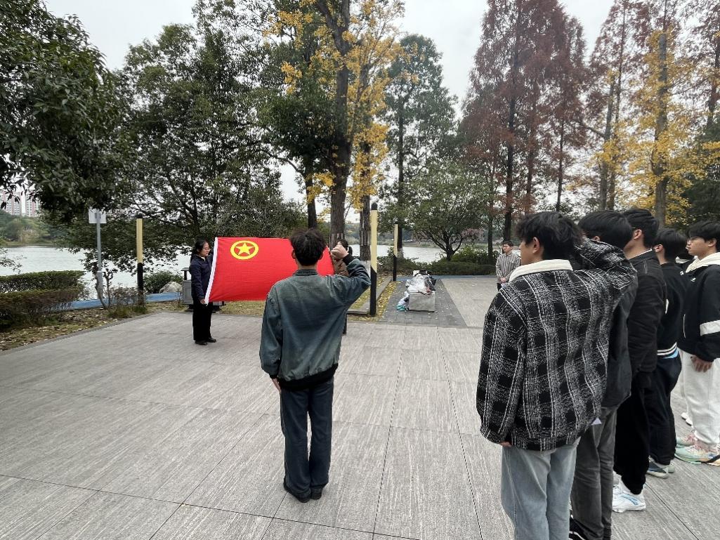 紧接着,新团员入团仪式正式开始。院团委员工副书记徐展翼宣读新团员名单,院团委副书记申鑫为新团员逐一佩戴团徽。在朱远诚的带领下,新团员们面向团旗,庄严宣誓,誓言坚定有力,充分展现了青年一代的责任与担当。最后,新团员代表贾泽坤上台发言。他结合国家公祭日的意义,提出作为新时代青年应牢记历史、奋发图强,以青春之名立鸿鹄之志,并表示将珍惜此次入团机会,不断提升自身的思想觉悟和综合素质。其发言诚恳务实,彰显了对未来的坚定信念与决心。