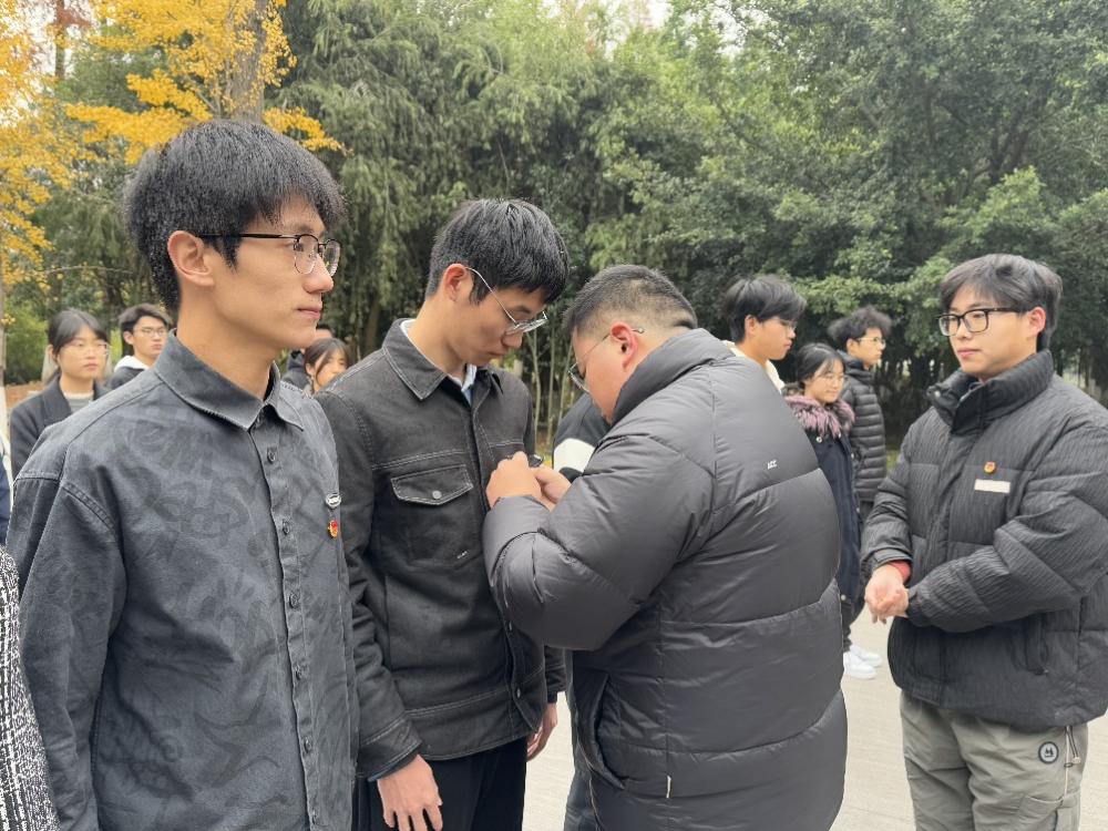 图为申鑫老师为新团员佩戴团徽