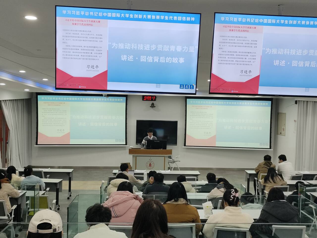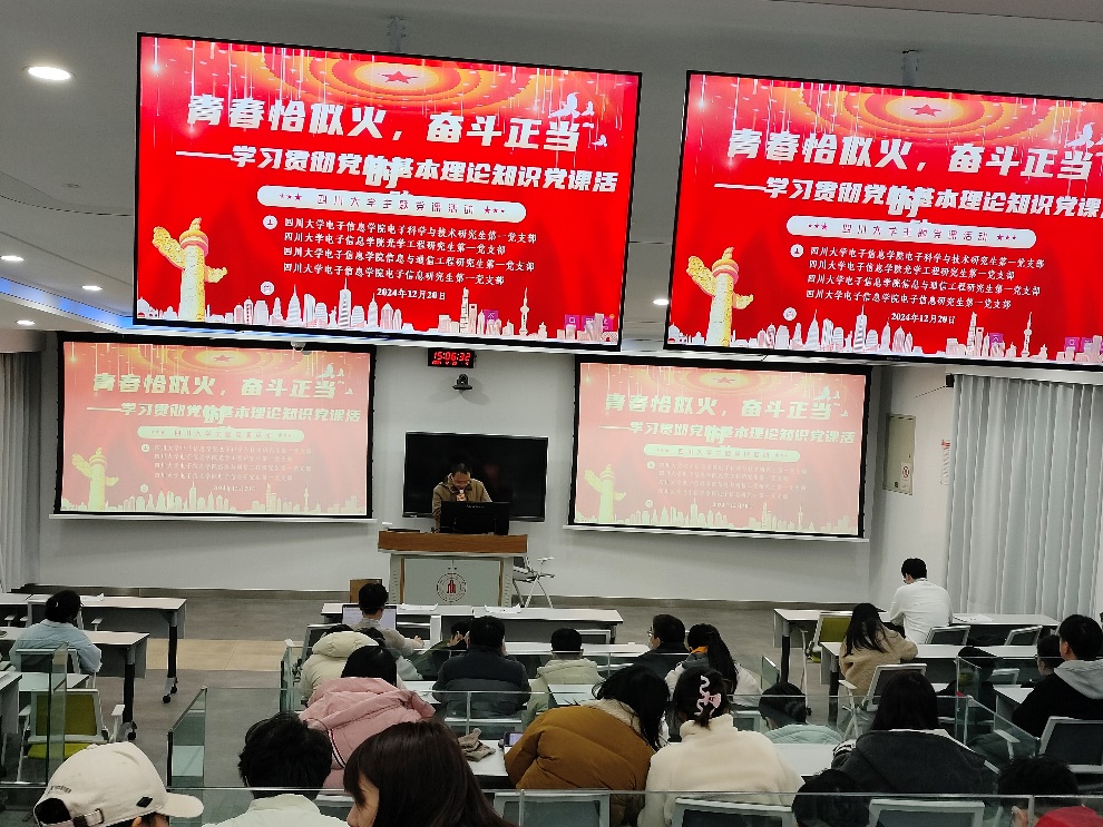 青年兴则国家兴,青年强则国家强。为深入学习贯彻习近平新时代中国特色社会主义思想,同时激发青年党员的创新精神和奋斗热情,2024年12月20日15:00,太阳网集团tcy8722电子科学与技术研究生第一党支部、光学工程研究生第一党支部、信息与通信工程研究生第一党支部和电子信息研究生第一党支部在望江校区基础教学楼C座103联合举办了一场主题为“青春恰似火,奋斗正当时”——学习贯彻党的基本理论知识党课活动。本次党支部学习大会由于鲲鹏同志主持,各支部全体党员和积极分子参会。