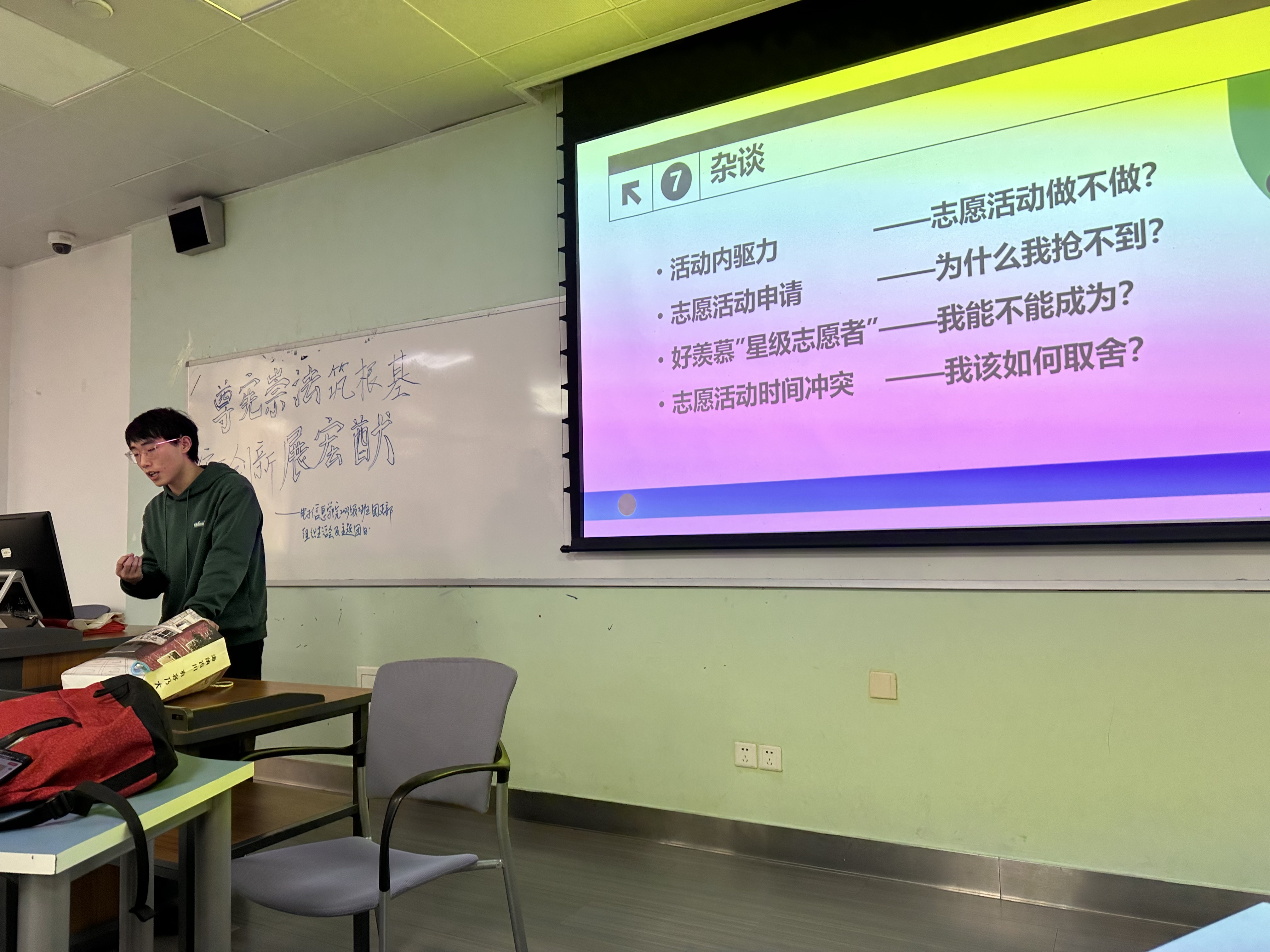 此外,本次活动还特别邀请了经验丰富的志愿者王宣易同学分享他的志愿服务经验,涵盖如何获取服务活动渠道、成为优秀志愿者的要素、志愿服务心得。他的精彩发言让在场的每位同学深受启发。