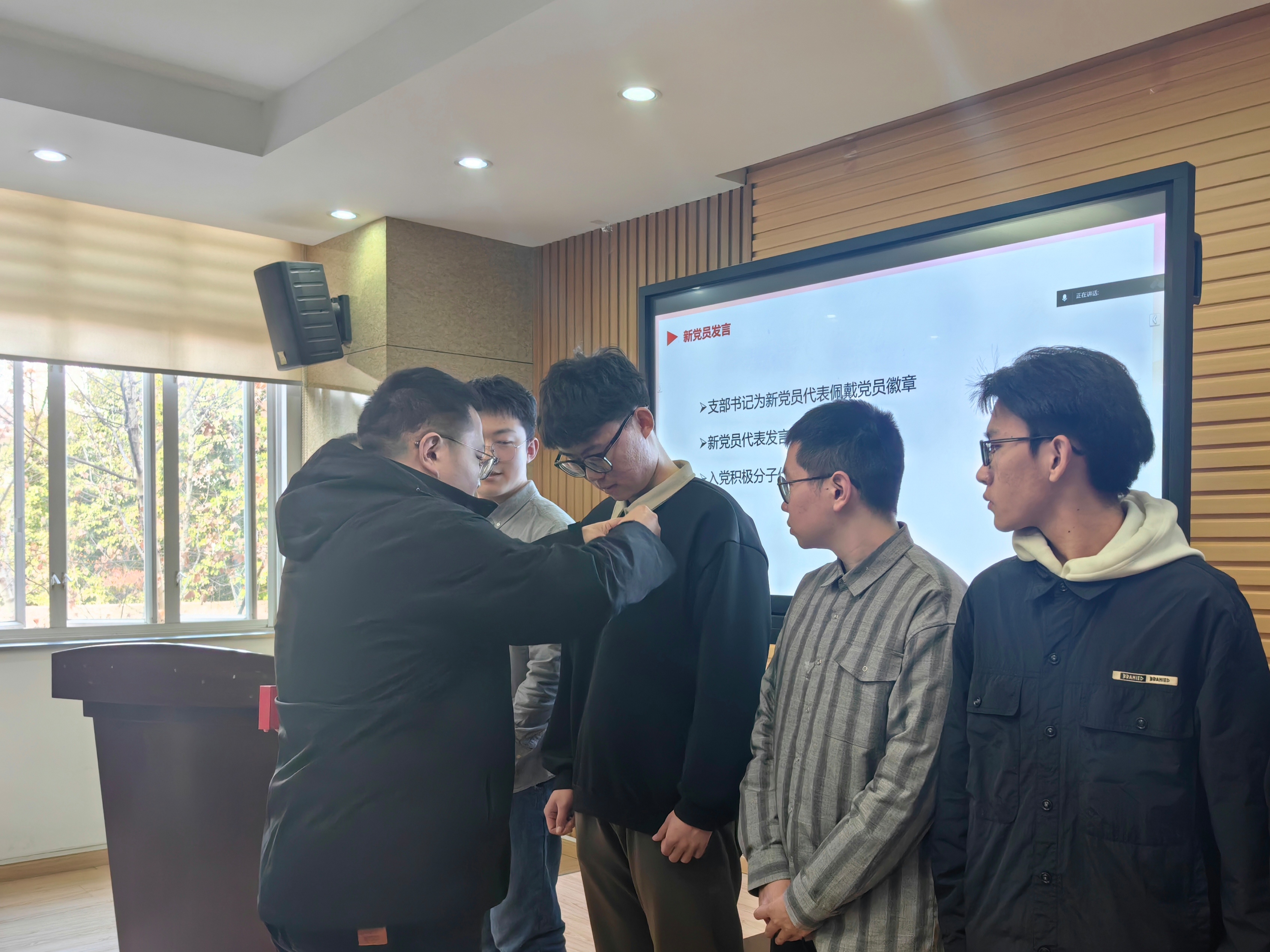 图为支部书记申鑫为新党员代表佩戴党员徽章