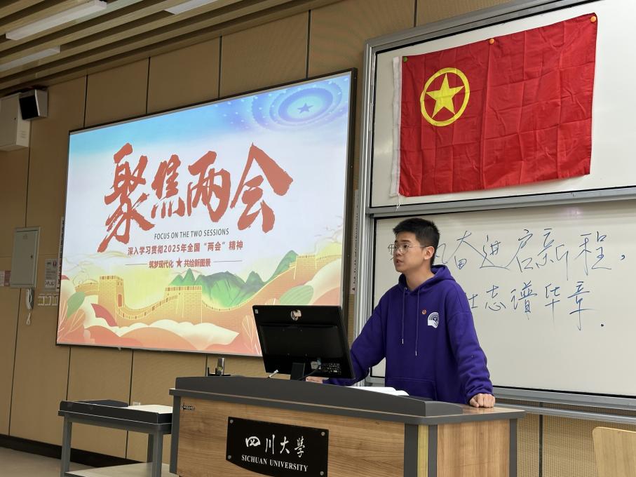 活动初始,2班班长蔡宏杰带领团员们一起学习两会知识。两会作为中国政治生活中的重要事件,不仅是国家制定发展目标的关键时刻,也是世界了解中国的窗口。通过学习,团员们对两会的重要意义有了更深刻的理解,特别是对两会中提到的“推动商业航空、低空经济等新兴产业安全健康发展”“培育生物制造、量子科技、6G等未来产业”等热点话题产生了浓厚的兴趣。随后青马工程弘毅班学员莫斌斌就两会精神进行分享。