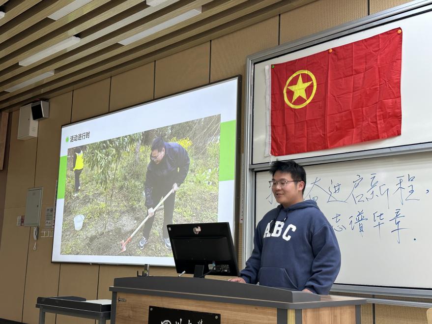接着,进行了志愿服务分享。3月8日,三个团支部集结18名团员前往成都市九隆成生态园进行植树志愿服务活动,响应三月雷锋月与植树节的号召。于是,在团日活动中,三名志愿者代表分享了自己在植树活动中的感悟。其他同学也纷纷表示,今后将继续参与各类志愿活动,用实际行动践行雷锋精神。
