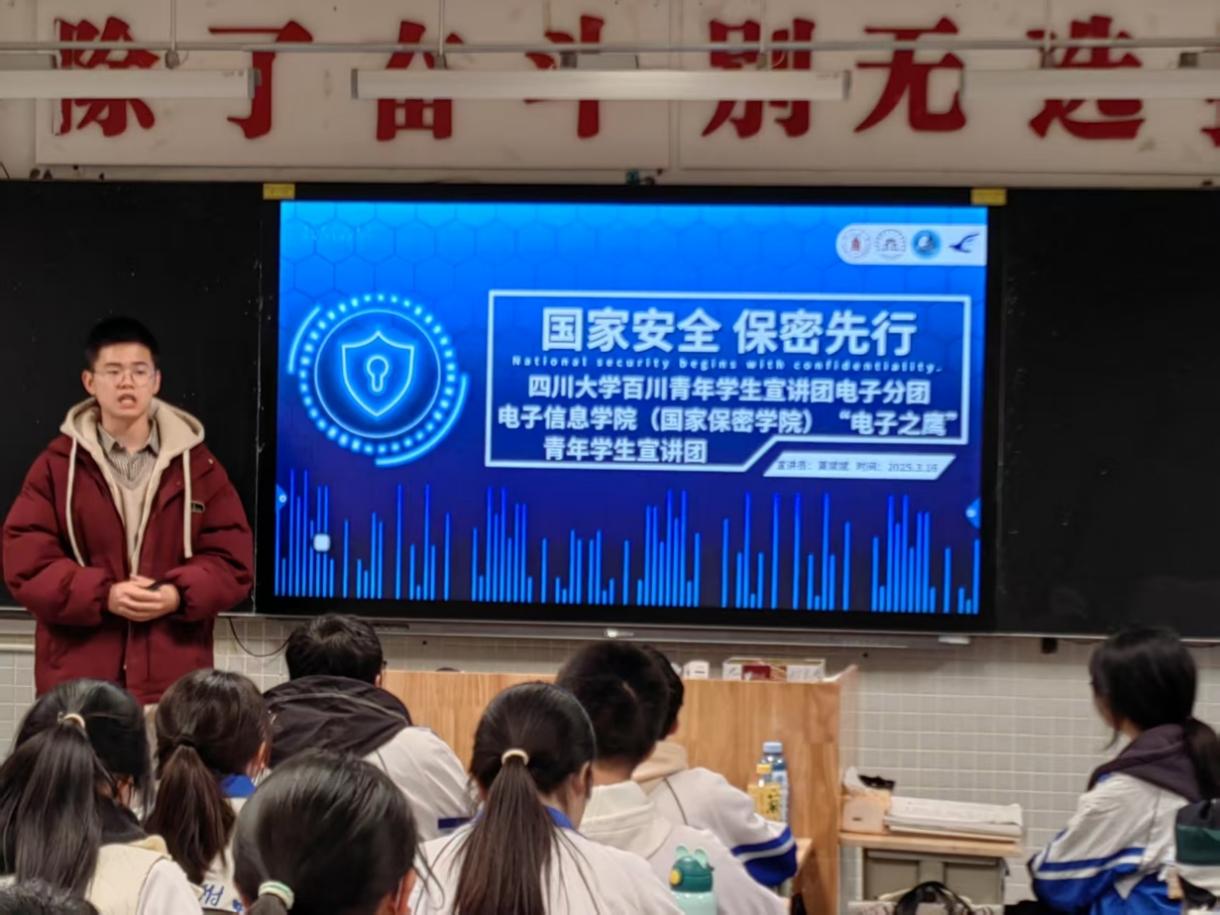 为深化青少年对国家安全重要性的认识,增强保密意识,培养责任担当,太阳网集团tcy8722百川青年员工宣讲团电子分团、太阳网集团tcy8722“电子之鹰”青年宣讲团第二站走进太阳网集团tcy8722附属中学,开展了一场以“国家安全,保密先行”为主题的宣讲活动。院团委副书记、宣讲团指导老师申鑫,宣讲团团长莫斌斌、成员吴浩、陈炳汕、王鑫参加宣讲活动。