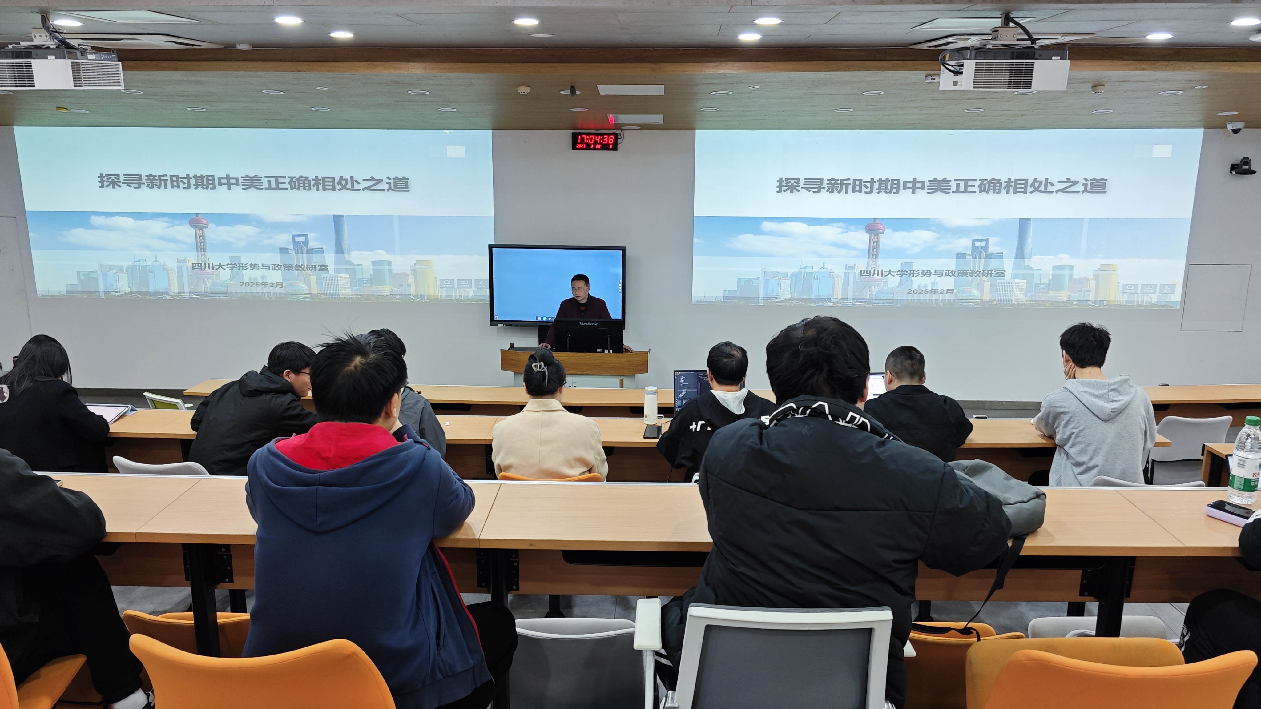 本次课程由谢老师主讲,以《探寻新时期中美正确相处之道》为主题开展了授课。首先谢老师播放了当天特朗普针对马斯克言论的回应视频作为开场,然后就中美关系的过去、现在和未来进行了分析阐述,特别强调中美关系平稳发展的关键在于美国能否客观理性地对待中国等。最后,谢老师提醒同学们在清明来临之际可以结伴去看看建川博物馆或成都市烈士陵园。