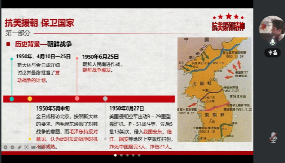 分享环节结束后,申鑫同志再次补充了南昌起义、抗美援朝、南方谈话的重要知识并强调了其带给我们的启示,总结了三段历史各自的历史原因与重大意义。此外申鑫同志还向同学们详细介绍了抗美援朝历史事件的经过,深刻地解读了抗美援朝战争和抗美援朝精神的重大历史意义,并对各小组的党史分享提出指导意见。
