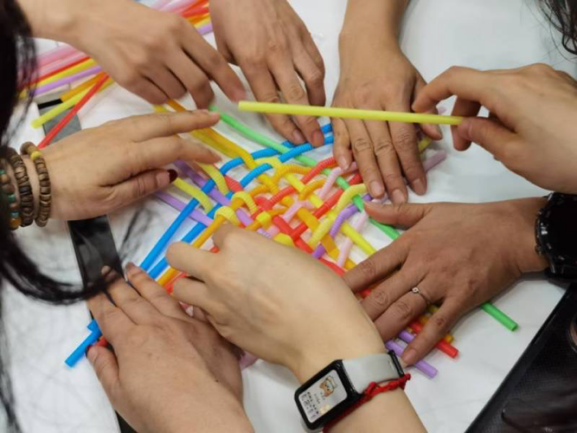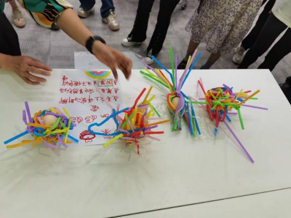第五周,活动步入团队工作阶段。辅导员分为两组,利用60根吸管和两个生鸡蛋完成“防蛋背心”游戏,设计出能让鸡蛋从三米高空落下而不碎的作品。面对挑战,大家集思广益、分工明确,共同制作出别出心裁的“防蛋背心”,经过检测,其中三个作品从高空坠落保持完整。通过游戏老师们体验到团队合作带来的成就感,共同学习了团队辅导的设计原则,深入探讨了游戏背后的理论依据以及如何在员工活动中带给员工启示。