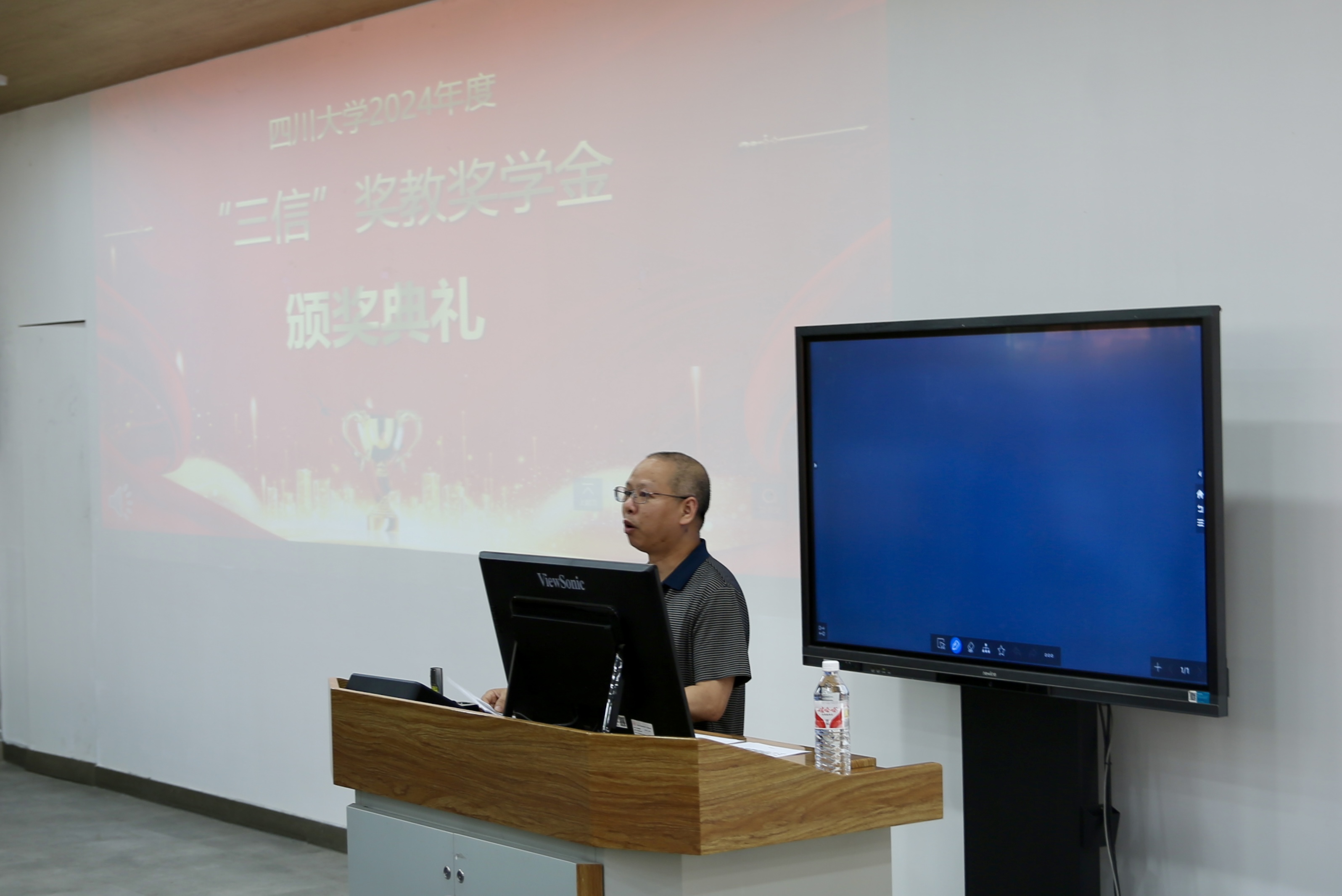 随着嘹亮的国歌声响起,典礼正式拉开帷幕。首先由丁明总经理讲话,他详细介绍了三信公司在国际国内社会经济发展的大背景下,不断克服困难、改革创新,适应行业发展持续取得优良业绩的现状,并宣读了2024年度“三信”奖教奖学金获奖名单。随后兰骏同学作为获奖代表发表获奖感言,他对公司的培养和“三信”公司的捐赠助学表示感谢,表示自己作为一名川大电子人,未来将继续努力学习并掌握扎实基础,勇于创新,为国家和社会做出更多贡献。然后举行了颁奖仪式,颁奖嘉宾、领导为获奖师生颁发证书,并合影留念。