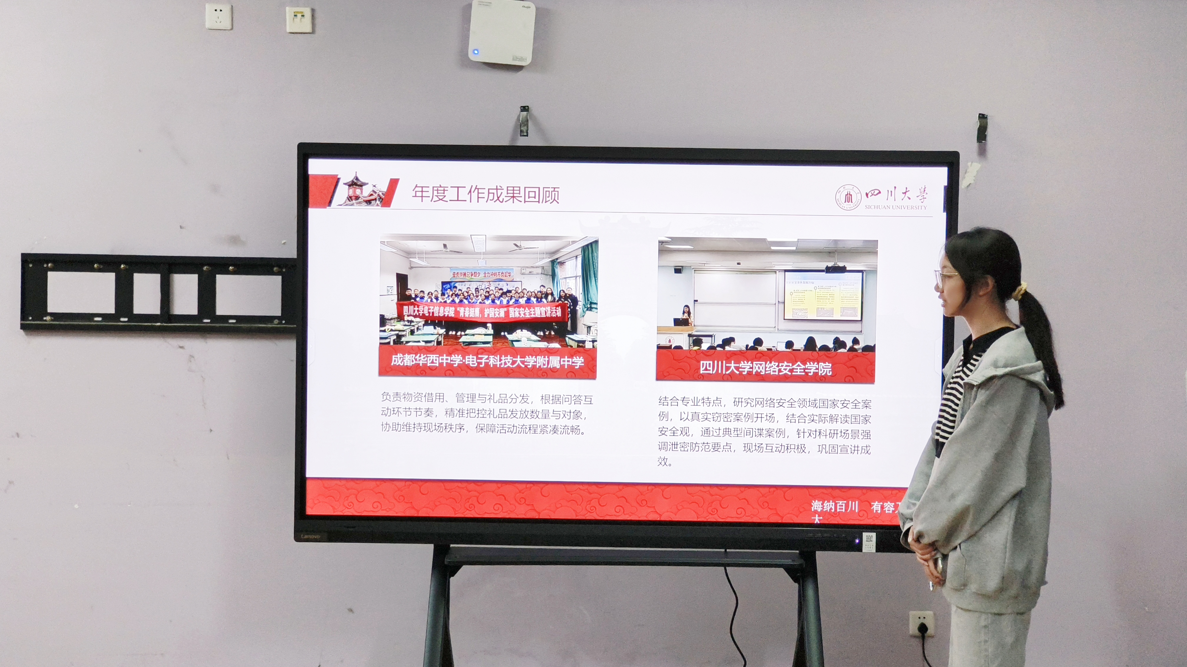 宣讲团团长莫斌斌主持了本次会议。他首先对这一学年宣讲团的工作进行了全面回顾。在过去的一年里,宣讲团紧密围绕 “国家安全” 这一主题,积极投入备课工作,并针对大中小学不同的宣讲群体,精心设计了三种不同的课程,累计开展了二十余场宣讲活动,覆盖人数超过一千人次。同时,宣讲团主讲课程《国家安全,保密先行》荣获了全国高校青年宣讲联盟 2024-2025 学年春季学期精品课程的荣誉称号。