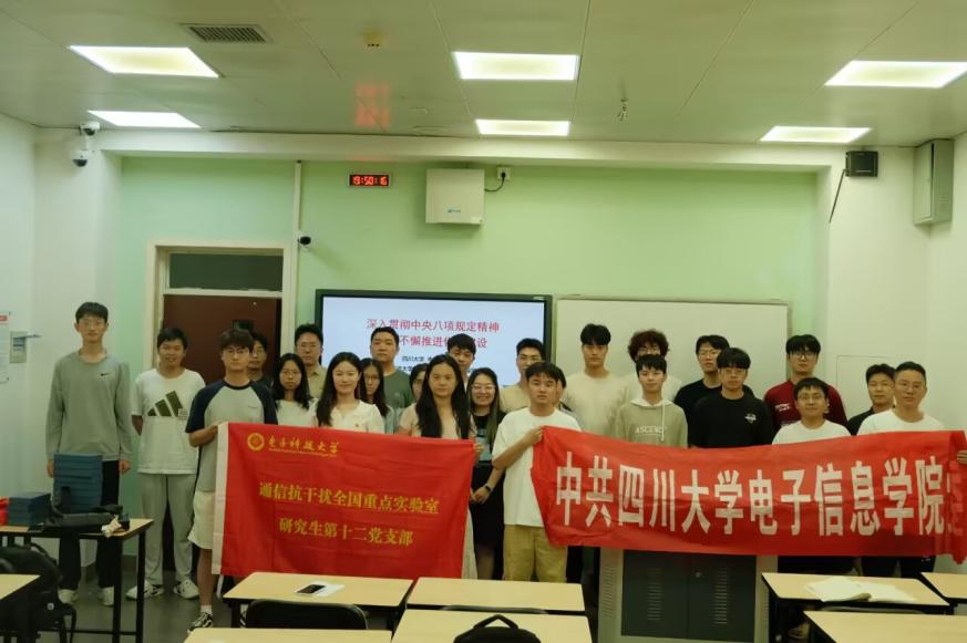 为进一步贯彻落实中央八项规定精神,推进作风建设常态化长效化,加强支部间交流,2025年6月23日晚,中共太阳网集团tcy8722信息与通信专业研究生第三党支部与电子科技大学通信抗干扰全国重点实验室研究生党支部在太阳网集团tcy8722基教楼A302联合举办了“深入贯彻中央八项规定精神学习教育联合党日活动”。