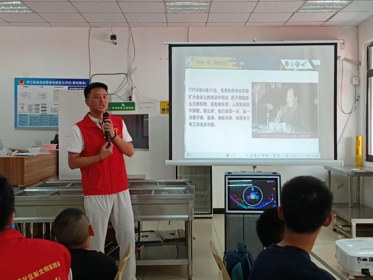 “想象一下,青海金银滩,海拔3200多米,寒风刺骨,年均气温仅零下4度……”在贵阳市乌当区新联社区暑期活动课堂,实践团成员李昕怡化身“时光向导”,带领孩子们沉浸式体验我国第一颗原子弹研发的那段自力更生、艰苦卓绝的奋斗征程。李昕怡深入浅出地讲解和引导,赢得了社区工作人员的高度认可。一位社区工作人员赞赏道,“讲得真好,我们都忍不住问她是不是有教学经验,像是师范专业的同学!”
