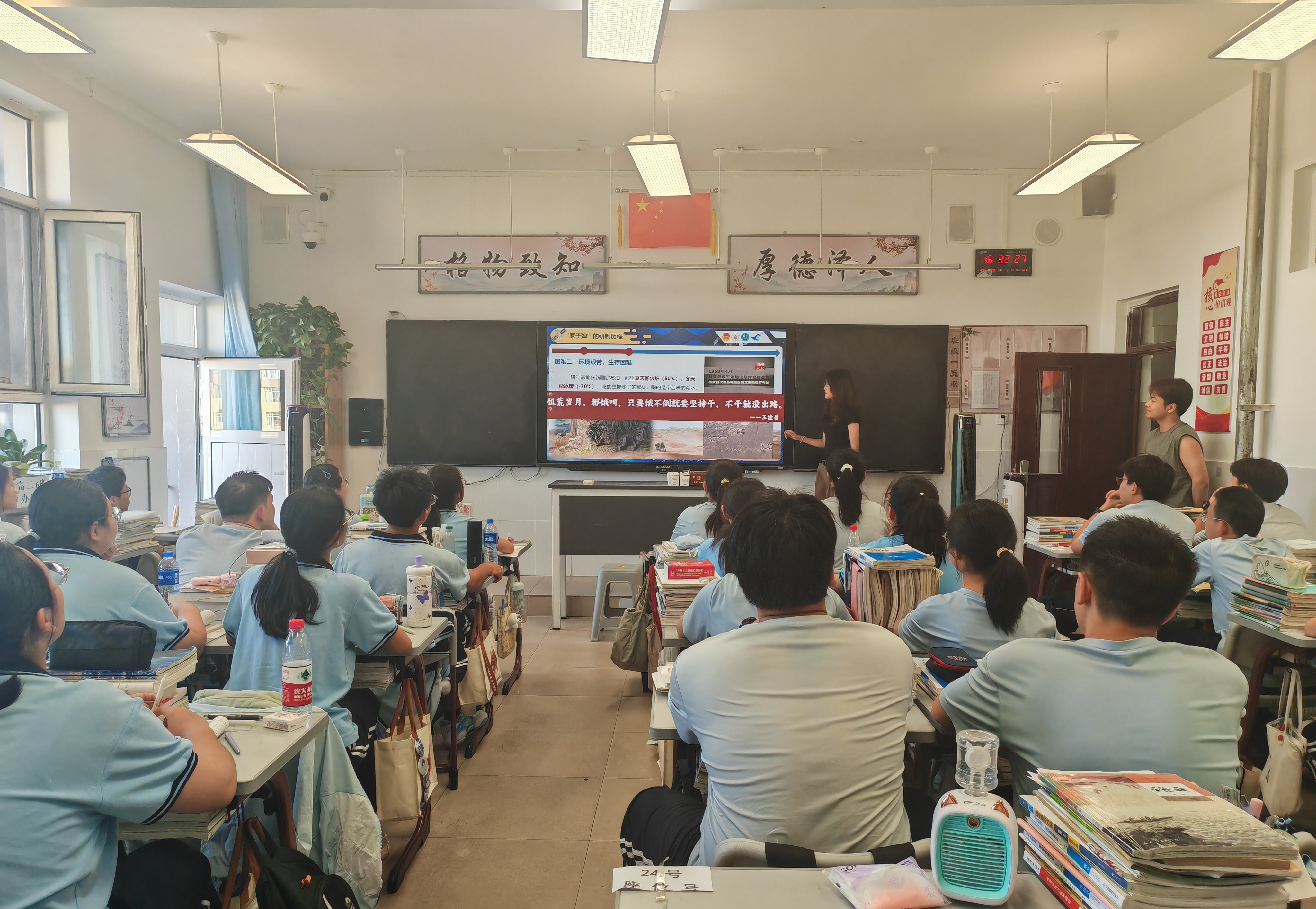 图为高语晗在赤峰市林西县第一中学的课堂上讲解我国第一颗原子弹的研制历程