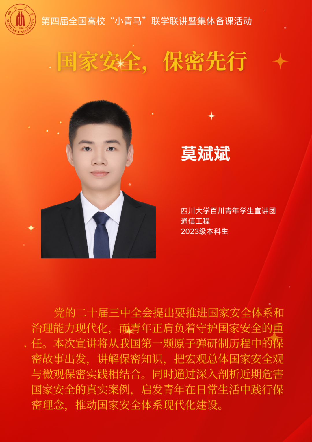 在第四届全国高校“小青马”联学联讲暨集体备课活动上,实践团团长莫斌斌进行了线上宣讲。他从我国第一颗原子弹研制历程中的保密故事出发,讲解保密知识,把宏观总体国家安全观与微观保密实践相结合,并通过深入剖析近期危害国家安全的真实案例,启发青年在日常生活中践行保密理念,筑牢国家安全屏障。
