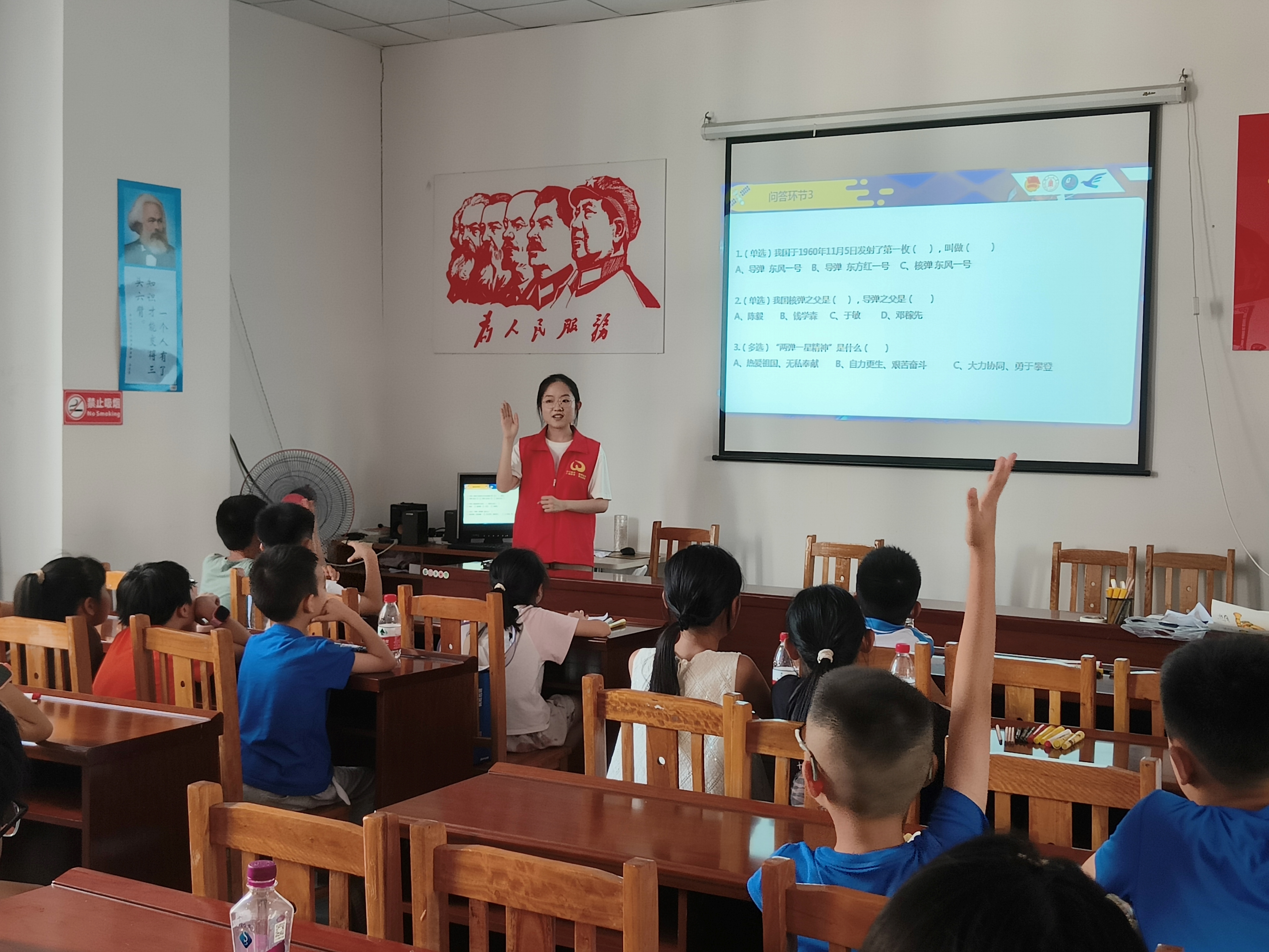 图为秦国耀在乐山市夹江县青衣街道迎春社区暑期托管班上为孩子们讲解“两弹一星”的研制背景