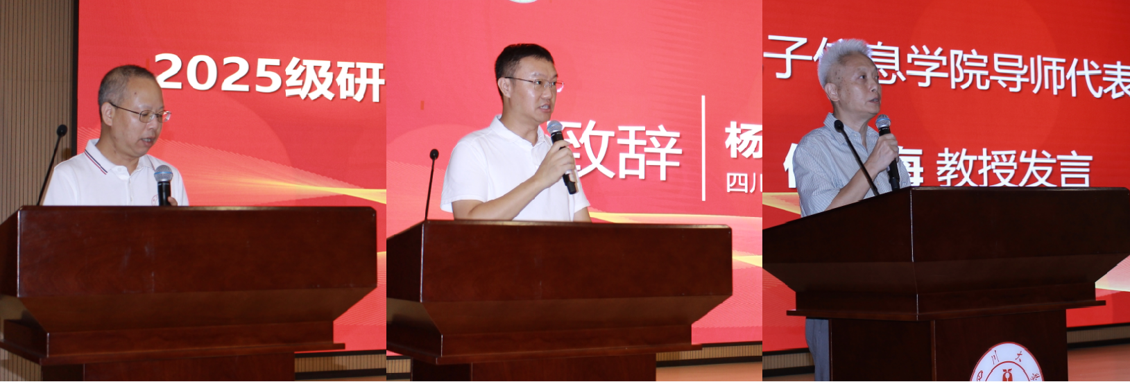 图 2 (从左至右)廖勇明副书记主持典礼,杨阳经理致辞,导师代表何小海教授发言