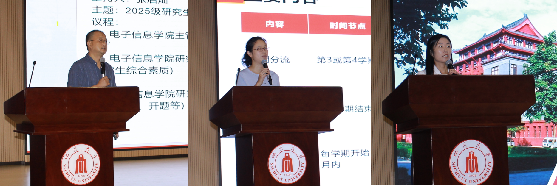 图 4 (从左至右)张启灿教授、赖华老师、冀红云老师为新生做入学教育