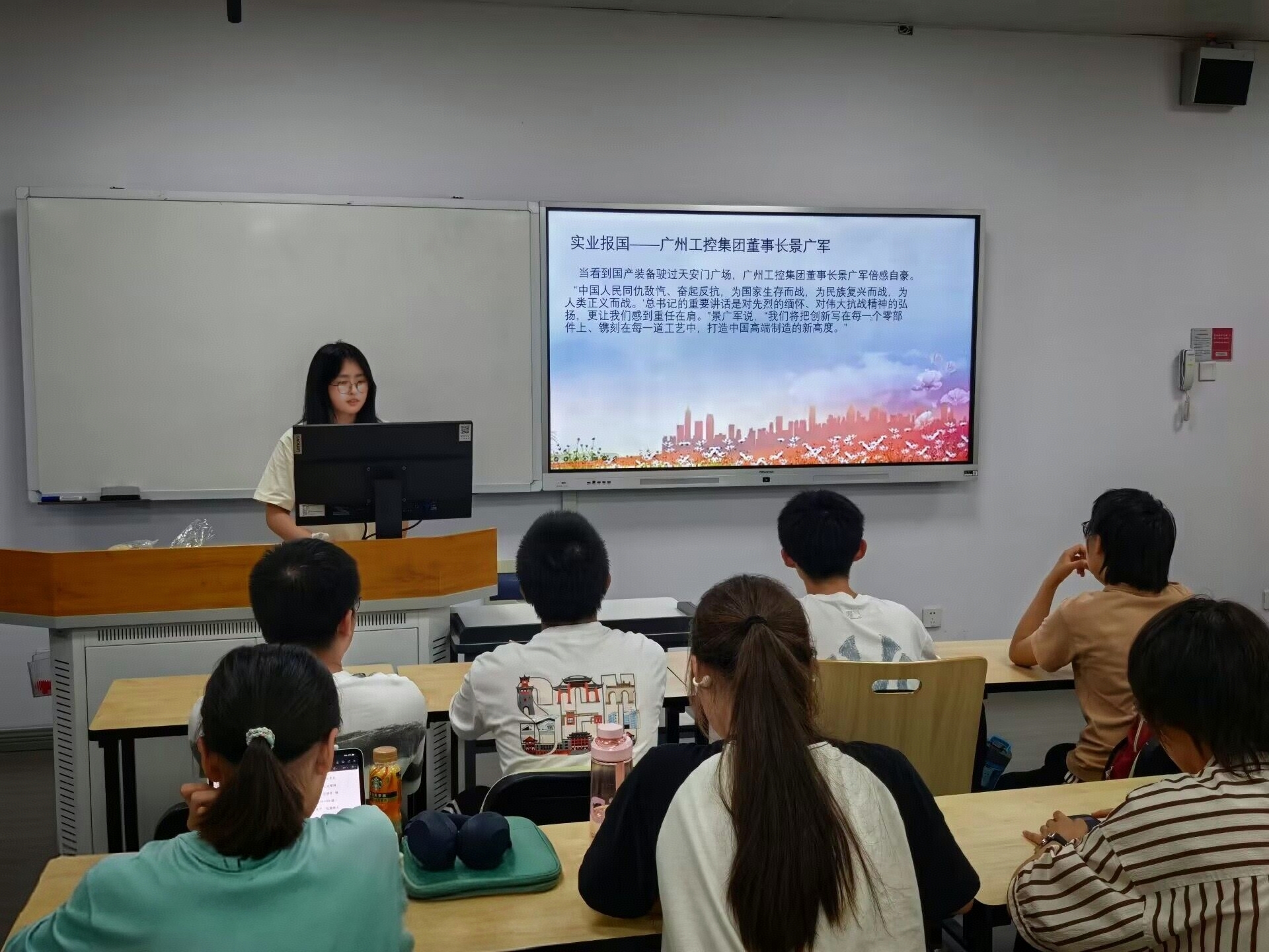 聆听时代强音,赓续红色血脉,随后,团支部书记彭燕同学带领团员们学习习近平总书记在纪念中国人民抗日战争暨世界反法西斯战争胜利80周年大会上的重要讲话精神,讲述101岁老兵孙文秀和广州工控集团董事长景广军的奉献故事以及观看九三阅兵的感触。随后,她介绍了望江校区江姐纪念馆,并带领团员们共同观看《弘扬伟大抗战精神 做光荣自豪人》的思政大课。最后,她强调作为共青团员,更应弘扬伟大精神,凝聚奋斗力量。
