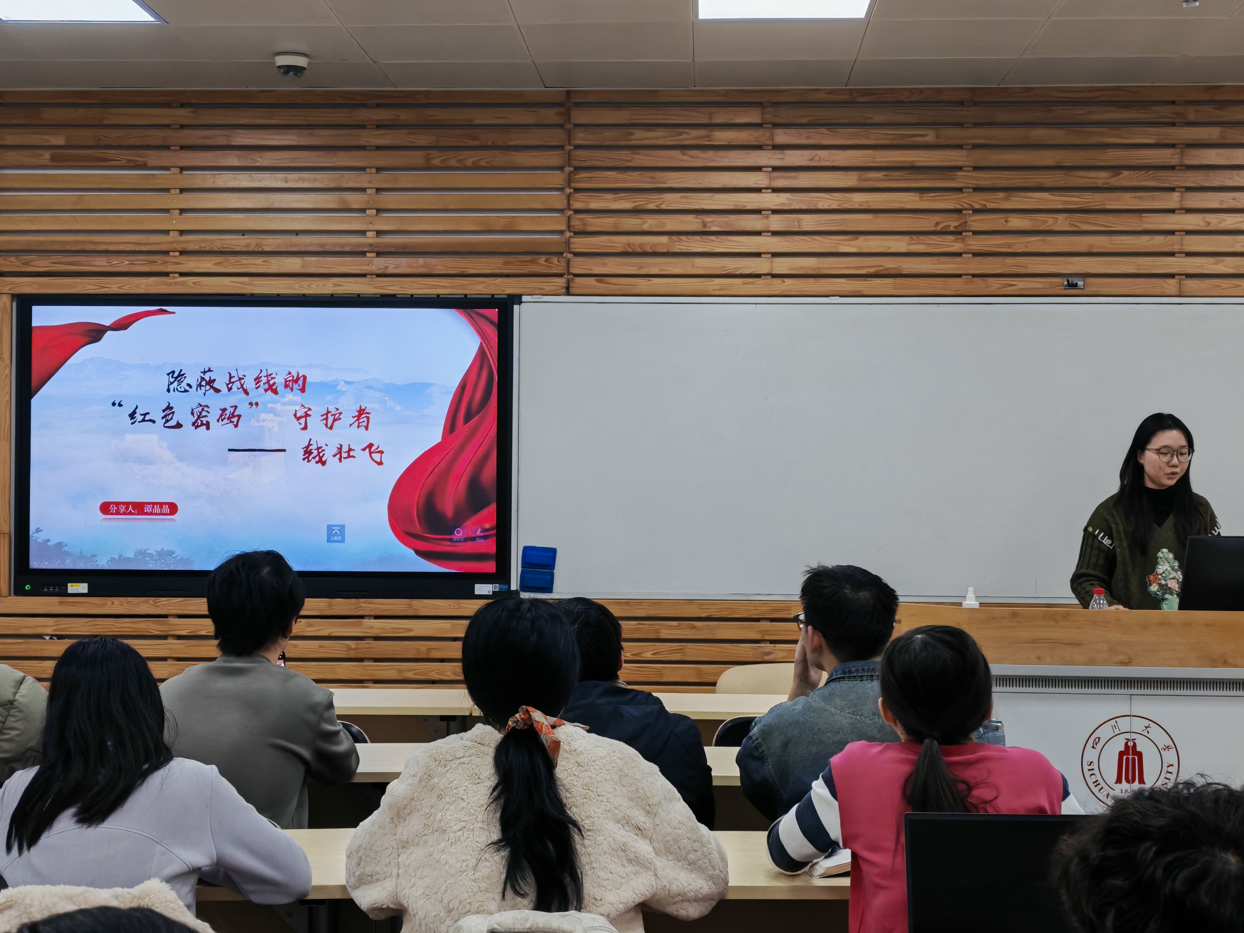 随后,赵培凯小组分享了铁人王进喜的相关事迹,向各位同学展示了伟大的“铁人精神”。谭晶晶小组介绍了钱壮飞打入敌营机智周旋,在顾顺章叛变时冒死报警,挽救党中央的事迹。龙佳艺小组讲解了1998年抗洪救灾的故事,回顾了数以十万计的党员舍生忘死、奋斗在第一线的伟大壮举。最后,王可小组讲述了著名战斗英雄董存瑞的故事,与会人员感受到他用热血和生命铸就的伟大精神。