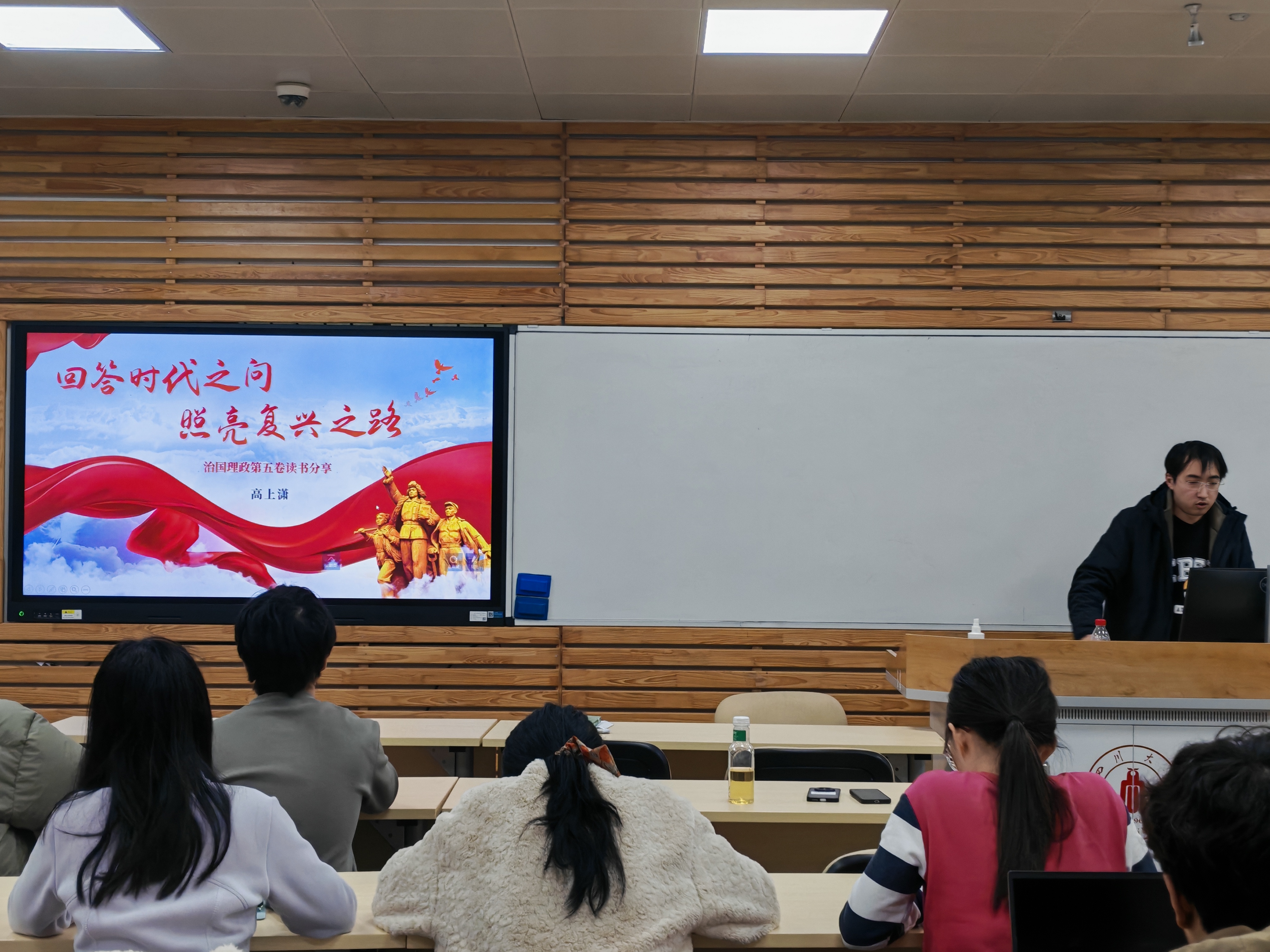 读书分享环节,高上潇同学分享了《习近平谈治国理政》第五卷,讲述如何去推动中国式现代化建设。周启航同学从推动我国绿色发展,注重生态文明建设所做出的相关举措进行分享。