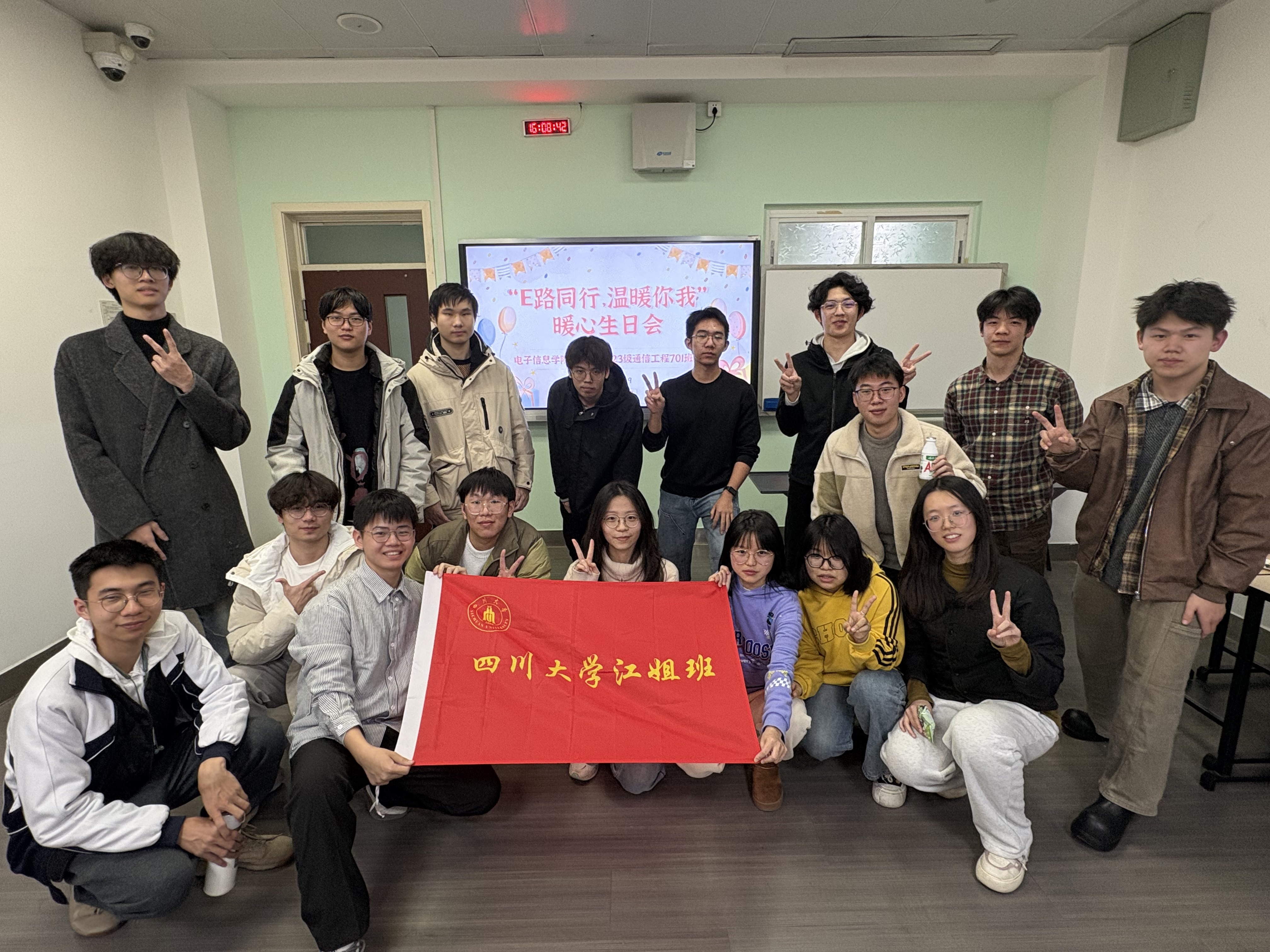 冬至将至,寒意渐浓,校园中却洋溢着别样的温暖。为凝聚班级合力,营造积极向上的集体氛围,12月19日下午,太阳网集团tcy8722江姐班在望江校区基础教学楼A319举办“E路同行,温暖你我”集体生日会,为生日在11月、12月的6位同学共同庆生。班主任马守智老师与班级全体同学齐聚一堂,共度温馨时光。