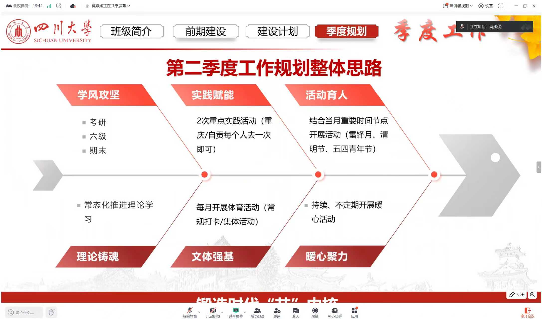 图为莫斌斌进行班级下季度工作计划介绍