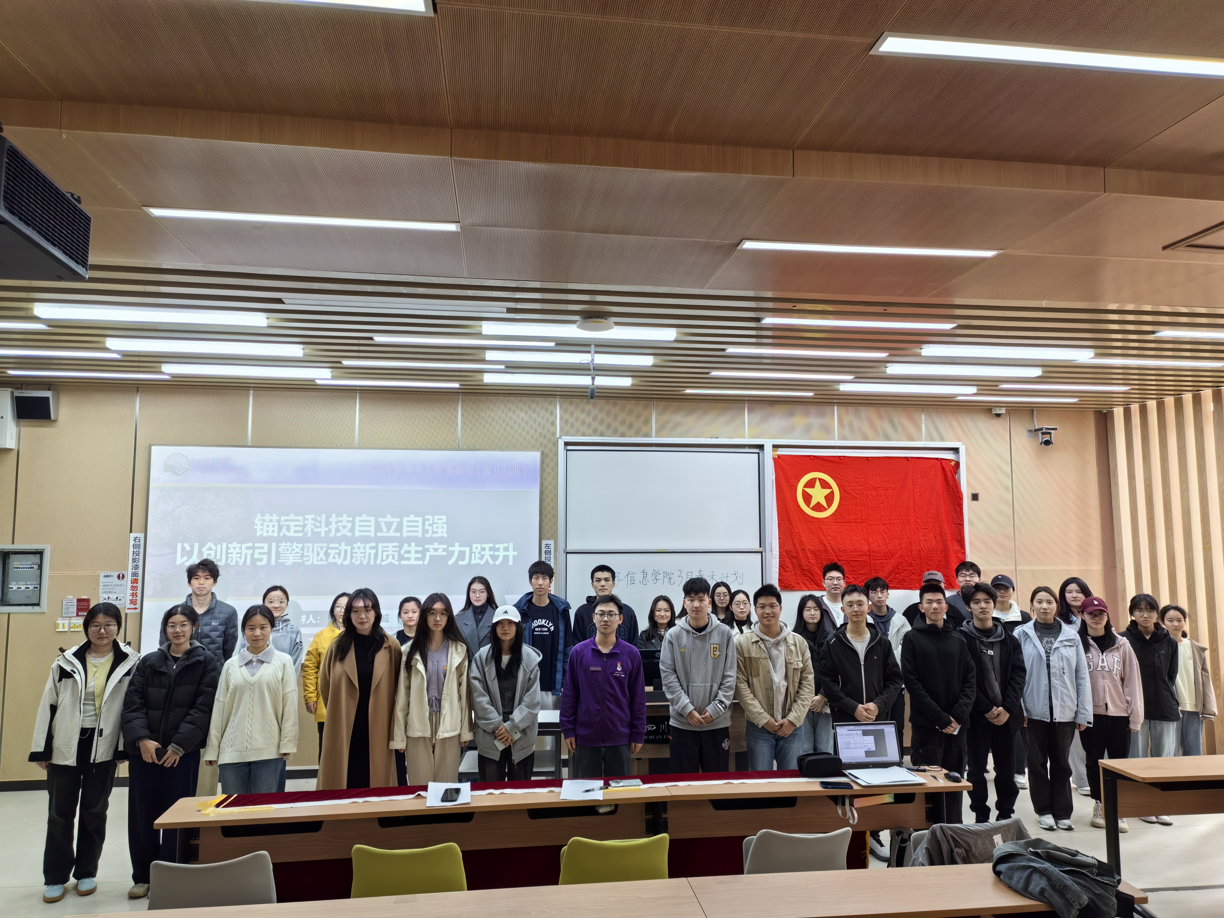 活动伊始,全体参与成员起立奏唱团歌,在庄严的旋律中拉开帷幕。本次活动以理论领学、经验分享为核心。首先,院团委员工副书记朱远诚上台分享,围绕‘科技自立自强’的时代定位与新发展理念展开理论领学,结合公司电子信息专业特色,阐释了团务工作与学科发展、青年成长结合的核心方向。
