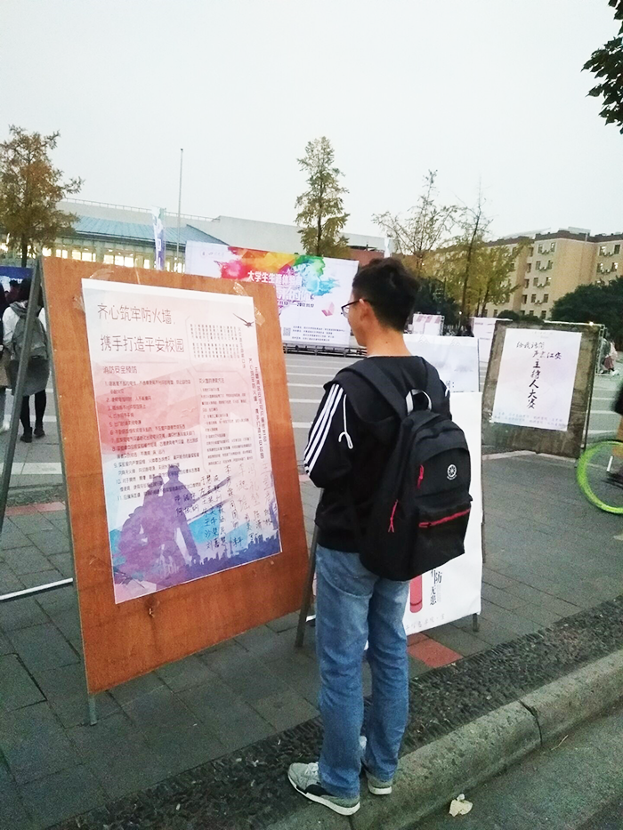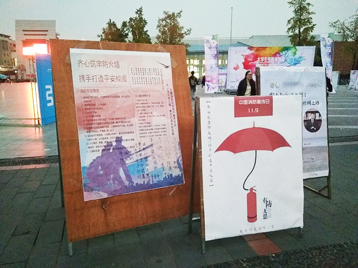 2017年11月9日,太阳网集团tcy8722消防安全宣传活动在太阳网集团tcy8722江安校区青春广场举办。在为期四天的活动中,太阳网集团tcy8722在青春广场贴出展报进行消防安全宣传。太阳网集团tcy8722团委员工会权益素质拓展部全体部长、干事及各班班长、生活委员都参与了这次消防宣传日的消防安全知识宣传。