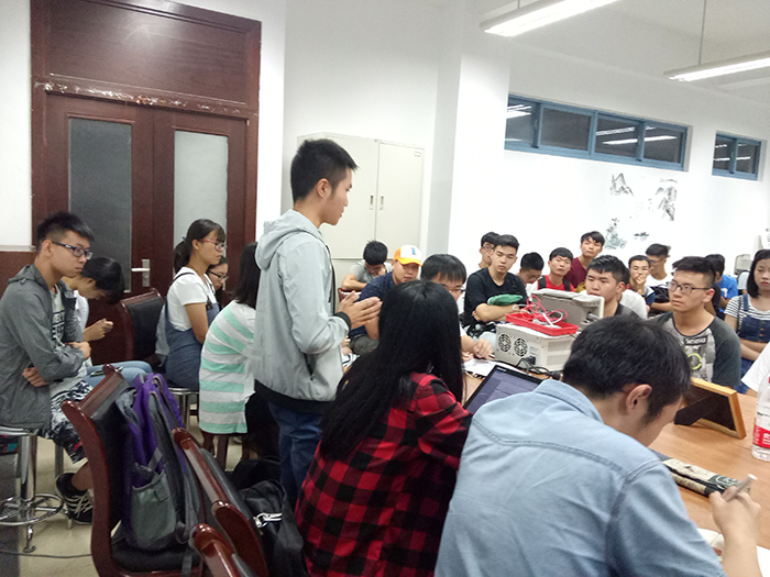 19:10,科技园第一次例会准时开始。大家围坐在科技园行政部的会议室内。首先,主席谭雅琪发表了简短的讲话。由于此次例会是招收2017级新干事后的第一次例会,所以主席进行了自我介绍并表示了对新成员的欢迎,并且对于宣讲招新工作中付出辛勤努力的部长表示了感谢。然后何嘉岳、唐俊、刘浩宇、胡澍主席依次自我介绍,又交代了一些关于科技园授课、考核、工作、纪律的事宜。其次,四大部门所有部长以及副部长依次进行了简短的自我介绍。接下来,2017级干事们依次介绍了自己的姓名、所在部门、特长爱好,并由此寻找与自己有共同爱好的朋友。部分干事进行了才艺展示,现场气氛活跃、融洽,与“科技园E家人”的群名称十分契合。最后,各部门各自进行了内部会议。