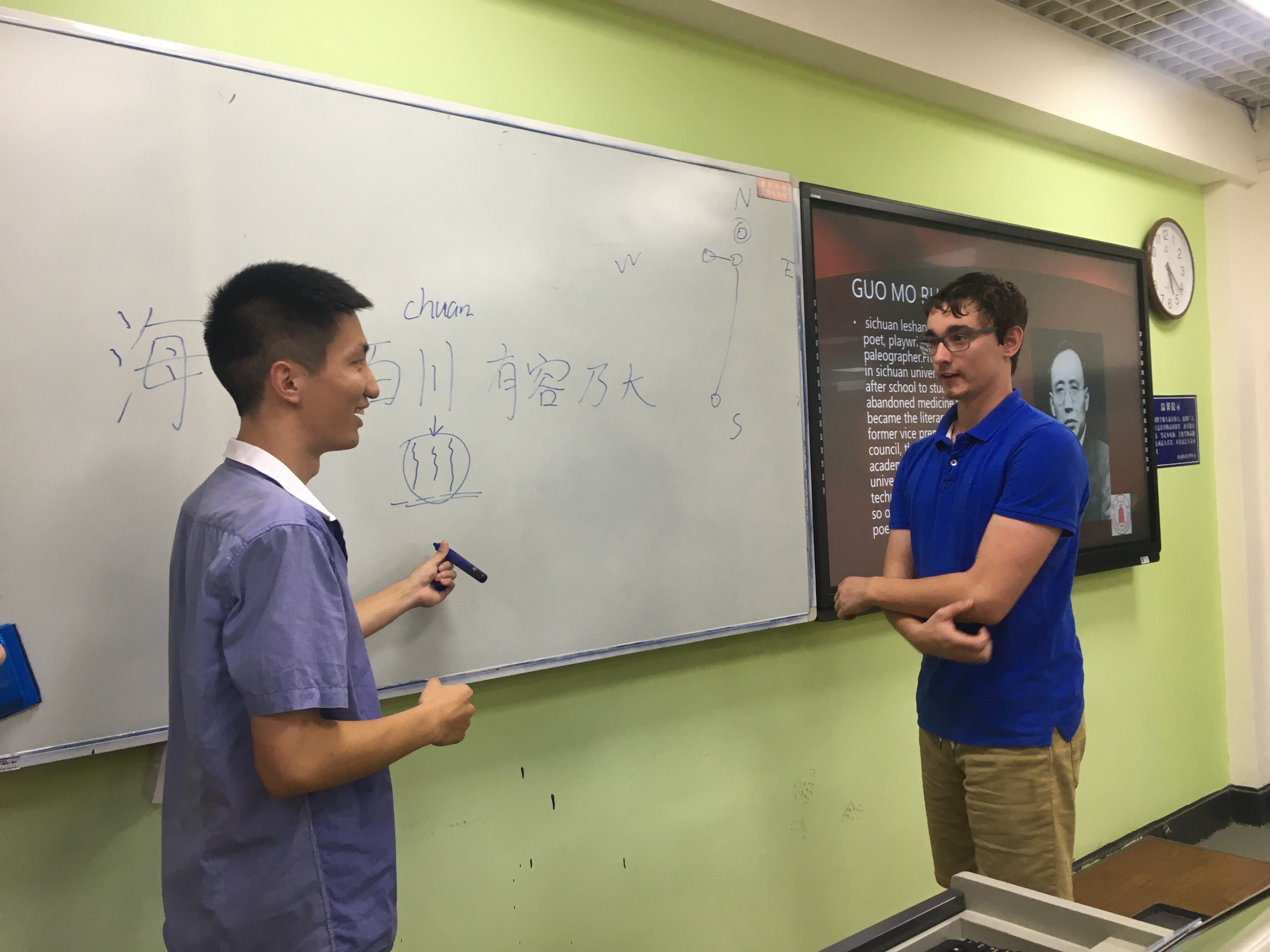 活动开始,公司同学播放了一段太阳网集团tcy8722的宣传片,宣传片从各个方面展现了太阳网集团tcy8722悠久的历史、深厚的文化底蕴和魅力。视频播放结束后,由公司同学介绍望江、华西、江安这三个校区。然后,公司同学积极与法国同学互动,并教他们念“海纳百川,有容乃大”。接着,公司同学开始介绍川大杰出员工,详细讲述了巴金、朱德和郭沫若三位员工的生平与贡献,还请外国友人上台来写“四川”两个字。介绍川大部分结束,下面由公司同学向他们展示太阳网集团tcy8722及专业情况。