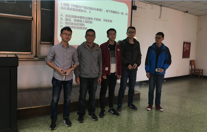 党的十八届六中全会10月24日至27日在京召开之后,本次竞赛旨在加强同学们对党的了解和认识,重温党的光荣历程,促使广大团员青年积极向党组织靠拢,为党组织输入新的血液,以趣味十足的形式帮助大家积累有关党的知识。此次竞赛的参赛队伍共有8队,每队的党员同志们都蓄势待发,下午两点,由肖聃同志宣布此次竞赛正式开始。竞赛主要分为四轮:第一轮:共答题—填空题;第二轮:必答题—选择题;第三轮:互动环节;第四轮:风险题—选择题和简答题。8组参赛队经过激烈的角逐之后,最终16级硕博第二党支部以10分的微弱优势夺得此次党知识竞赛的一等奖,14级本科党支部,16级硕博第一党支部和16级硕博第四党支部获得二等奖,13级本科党支部,16级硕博第三党支部,15级硕博党支部和14级硕博党支部获得三等奖。李军华老师还为获奖的队伍颁发了奖品并于获奖同学合影留恋,本次竞赛在轻松愉悦的分为中圆满结束。