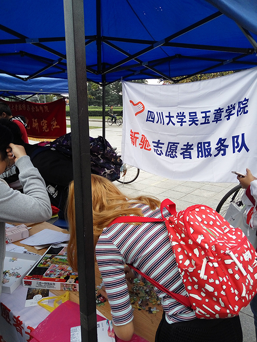 活动于上午8时准时开始。一部分志愿者负责给来往的同学们分发传单,向他们介绍无偿献血以及“血车进江安”的活动概况,并邀请他们做DIY拼图和欢乐找不同的游戏,这很快调动起来了同学们的热情。同学们在玩游戏收获快乐的同时,也很好地了解了献血的相关事宜。两个小时过去,下一班志愿者到来,接替工作也做得井然有序。19时30分,第一天的活动结束。