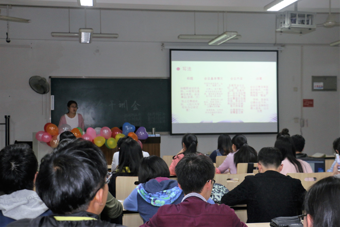 本次干训会是由七个公司联合举办的培训16级员工会新干事的主题活动,以PPT制作技巧与文案策划为主题,为新干事们讲授相关的知识。本次会议立足实际,引导16级新干事们提高自己的能力,学习更多的实用技巧,以更好地投入到员工工作中。相信通过此次培训,2016级的干事们能够以更高的素质、更娴熟的工作技能、更饱满的热情,为全校广大师生提供更好的服务!