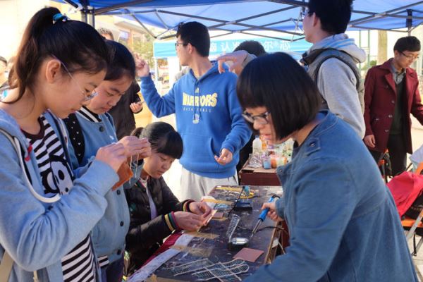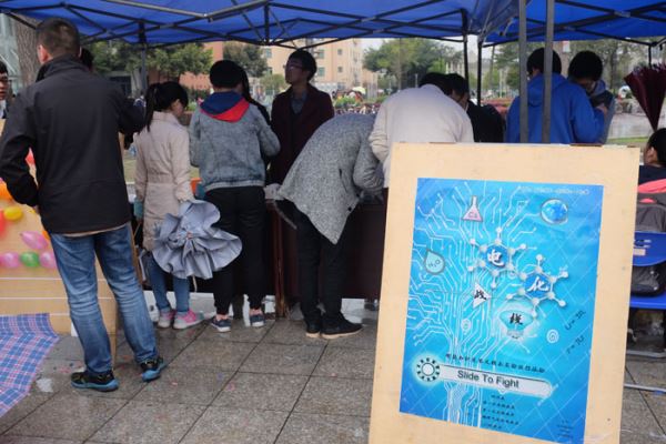 早上八点半,活动正式开始。值班人员准备好所需的各种物资,首先向同学们进行展示,新颖、独特的化学产物和电子产品让大家一饱眼福。同学们经过摊位,怀着一颗好奇心积极地参与活动。大家亲自动手做趣味化学实验、焊电路,体验动手的快乐。同时,在有奖竞答中,同学们不仅接触到了化学和电子知识,又拿到了主办方精心准备的礼物,无形之中也扩大了同学们的知识面。活动期间,摊位上定时展出更新奇的电子作品——光立方,给大家带来了视觉上的冲击,工作人员也耐心地为大家解释光立方的部分原理,让大家感受到了电子的魅力。化学公司的各位同学也积极地为大家演示了奇妙的化学反应,吸引了更多同学参与。此外,参与活动的同学也在我们准备的签名纸上留了足迹。整个活动一直持续到晚上6点,大家纷纷拍照留念,在一片欢声笑语中结束了活动。