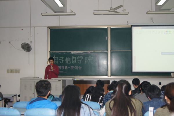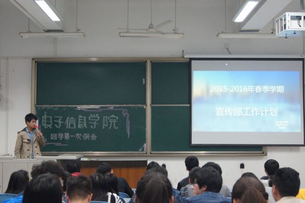 晚上7点整,例会正式开始。电子团学团副赖林首先走上讲台,他提醒在座同学们寒假已经结束,新学期开始,并且指出了本学期团学的三项重要事项:主席团助理选举、换届要求和创意策划大赛,同时希望大家能不忘初衷,认真做好作为干事的最后一学期的工作。接着,各部门的代表人依次走上讲台,大多以PPT幻灯片的形式向同学们展示了本学期各自部门的工作任务和计划。这使同学们对本学期团学的工作活动有了更加全面深入的了解,获得了同学们的赞同。之后,赖林团副再次上台对例会进行了总结,并指出了例会中一些需要改进的不足之处。最后,在同学们积极活泼的气氛中,赖林团副宣布例会正式结束。