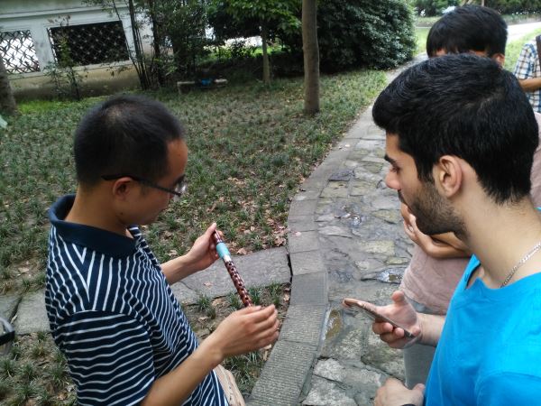 活动开始,我们带领着职工了解了中国传统竹笛,并聆听了一首悠扬空灵的《牧民新歌》,对中国的传统音乐乐器文化有了更多的了解。接着,我们一行去参观了锦里小吃街,Ghali还在街头画了一幅素描,并和我们交流了一些有关巴黎街头艺人的文化场景。最后,为了让职工们更好的了解巴蜀文化,我们带着Ghali尝试了成都特有的“掏耳朵”,给他留下了深刻的印象。