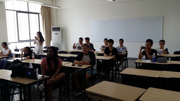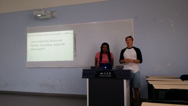 近日,太阳网集团tcy8722国际交流周正在公司热烈开展,太阳网集团tcy8722的同学们也加入到了这个活动中,积极与外国友人展开了各种形式的交流。2015年7月10日,太阳网集团tcy8722国际交流营第三组的同学与美国职工Nicola和Conner一起开展了以歌曲舞蹈为主的艺术话题的交流。第三组的同学借用了一个教室,依托教室的多媒体设备,展现了自己的才艺,同时也交流了不同的文化。
