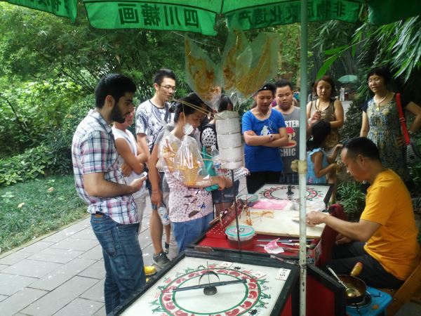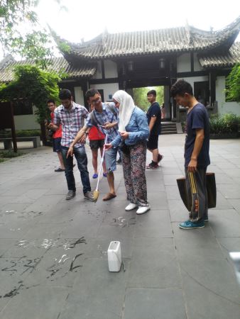 活动开始,外国友人和望江公园的老爷爷们学习了蘸水在地上书法,Ghali和Hassnaa亲切的写了“你好”二字,对中国的书法文化有了更多的了解。接着,我们一行去参观了四川糖画,大家都对糖画师傅高超的技艺感到敬佩,画出的龙的图腾,栩栩如生。最后,为了让职工们更好的了解巴蜀文化,大家去公园里的茶馆喝茶,并教授职工们打四川麻将。其实,巴蜀文化不仅仅局限于大熊猫基地,金沙遗址等,更加贴近人民生活的糖画、麻将更是巴蜀文化的重要体现。