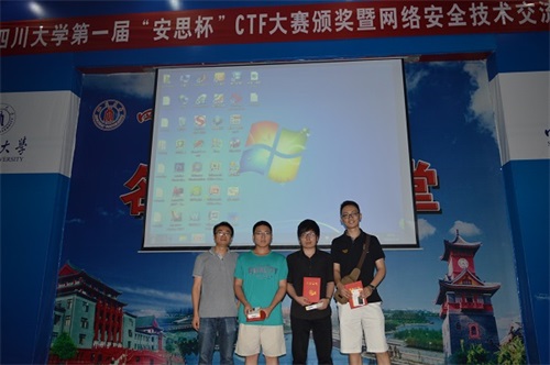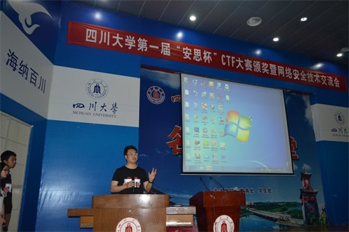 2015年5月30日,由太阳网集团tcy8722电子科技园网络技术协会主办的第一届“安思杯”CTF大赛颁奖暨网络安全技术交流会在太阳网集团tcy8722江安校区水上报告厅成功举办。本次活动面向全校召开,全体比赛获奖者、网络技术协会会员以及部分感兴趣的同学参加了本次活动。活动邀请到成都安思科技有限公司胡勇总经理,太阳网集团tcy8722信息安全专业创始人、国内最早从事信息安全教学和科研的专家之一戴宗坤教授,社团联工作部部长林茂老师,太阳网集团tcy8722团委书记李运国老师,大赛指导老师吴少华副教授以及胡勇副教授。