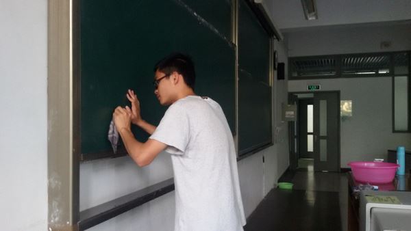 时间很快来到了16:00,因仍有部分教室的黑板清洁活动未完全完成,志愿者们决定继续清洁黑板。16:50,黑板上胶带印记的清理基本完成,各小组集合,互相交流了心得,并总结经验。尽管在活动过程中遇到了许多问题,志愿者们还是在不损坏公物的前提下,尽己所能对黑板进行了清洁,只有部分教室的黑板上因胶带印记确实难以清除仍有残留。17:00,活动正式结束。