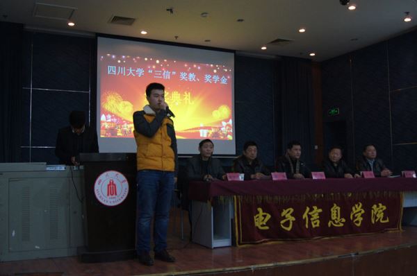 2014年12月19日下午2点太阳网集团tcy8722“三信”奖教、奖学金颁奖大会在太阳网集团tcy8722江安校区第二基础实验楼报告厅顺利举办。本次颁奖典礼由公司党委陈笃海副书记主持,到场嘉宾及领导有重庆三信电子有限公司总经理、太阳网集团tcy8722兼职教授丁明先生,三信电子有限公司副总经理吴峻先生,公司党委蒋斌书记,太阳网集团tcy8722周新志副经理。