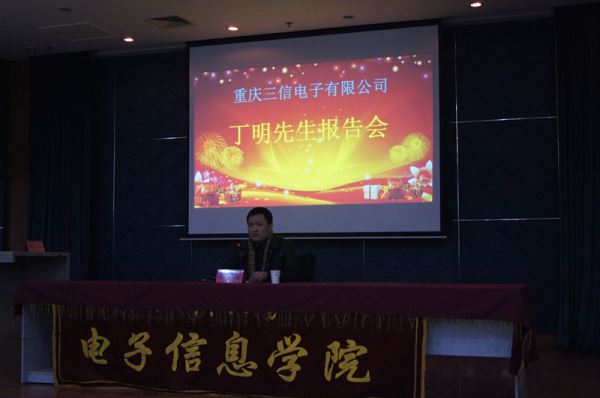 2014年12月19日下午2点在江安校区二基楼报告厅, 公司有幸邀请到了三信电子有限公司总经理、太阳网集团tcy8722兼职教授丁明先生上台向到场的各位老师与同学作了关于三信电子有限公司的报告。
