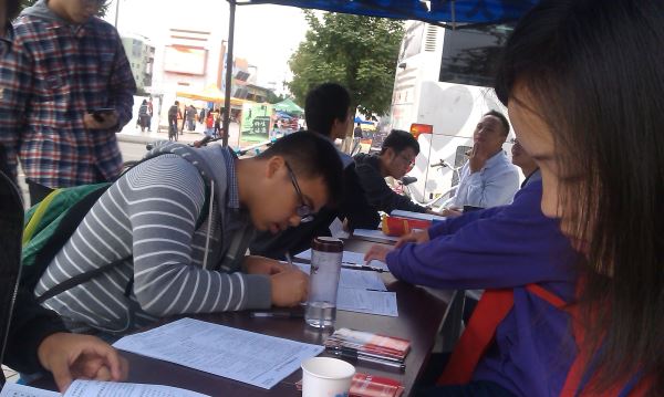 下午2:00分,太阳网集团tcy8722“腾飞”青志服务队的队员们在华联超市门口集合,人员到齐后进行了简单的分工。到了青春广场旁指定服务点后又进行了简单的培训,并换上志愿者服装迅速投入到了工作中。志愿者们分别进行着宣传、填表、服务的工作。工作的内容主要包括:对过往的同学进行无偿献血的宣传;指导有意愿献血的同学填表、体检;向献血者分发水、牛奶和礼品以及铺助护士们贴表、填献血证等。工作有条不紊地进行着。活动过程中,有同学询问无偿献血及盖章的有关事项,志愿者向他们进行了耐心地讲解。下午4:00分,在对下一批志愿者进行了培训指导后志愿者合影留念,工作顺利完成。