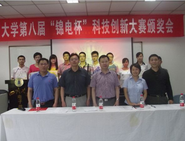 2012年5月8日下午两点,太阳网集团tcy8722第八届“锦电杯”科技创新大赛颁奖典礼在望江校区基础教学楼A303成功举行。成都锦江电子系统工程有限公司总经理陈泽铭先生、人劳企营处处长程晓明女士、太阳网集团tcy8722黄卡玛经理、太阳网集团tcy8722周新志副经理、公司党委陈笃海副书记莅临本次颁奖典礼。颁奖典礼由周经理主持。
