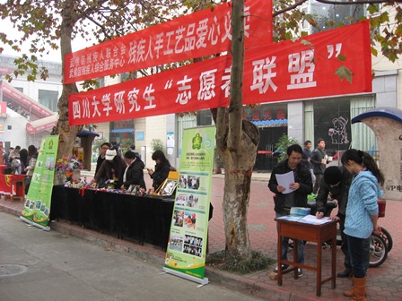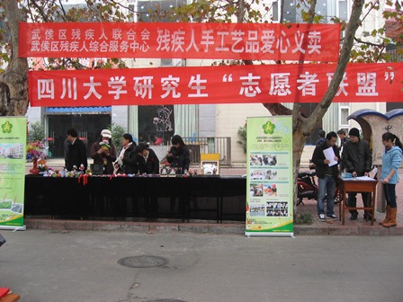 今年的12月3日,由电子、计算机、文新公司共同举办的志愿者联盟第一期活动之“隐形的翅膀”在东三食堂门口顺利展开,活动进行了残疾人日和残疾人自强不息精神的宣传,邀请到了武侯区残疾人联合会参加,他们带来了残疾人手工艺品到现场展示和义卖,引来了很多同学的关注,员工们纷纷报名参加后续的残疾人志愿者服务,这次活动顺利的举行,达到了预期的效果。