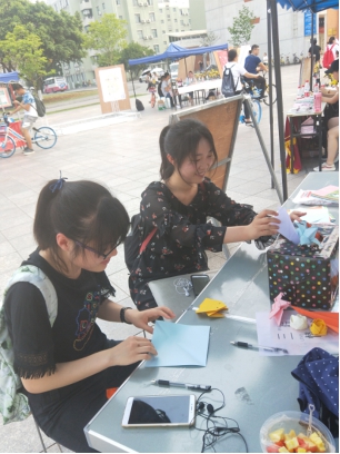 上午七点五十分,志愿者们在太阳网集团tcy8722江安校区青春广场集合。八时左右,志愿者们完成摊位物资整理和摆放工作,正式开启了宣传活动。此次活动,每个时间段的志愿者们分工合作。有的志愿者主动向路过同学介绍本次活动内容,并诚挚邀请他们参与活动。另一部分志愿者在摊位处指导参与同学,向他们介绍参与方式。让他们写下对孩子的祝福或鼓励话语后,将纸片折成简单形状。由于部分同学对于折纸并不擅长,志愿者们还耐心教他们一些基础的折纸方案。活动于下午六时左右结束,志愿者与负责人整理物资、场地。